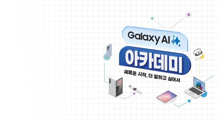 ‘Galaxy AI 아카데미 - 새로운 시작, 더 잘하고 싶어서’ 문구와 함께 스마트폰, 노트북, 태블릿 등 갤럭시 제품 이미지가 연결된 그래픽 이미지